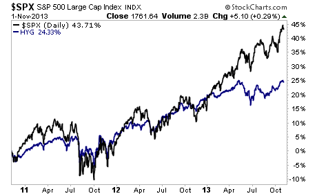 3) High yield debt has begun to diverge sharply from the stock market (see below).